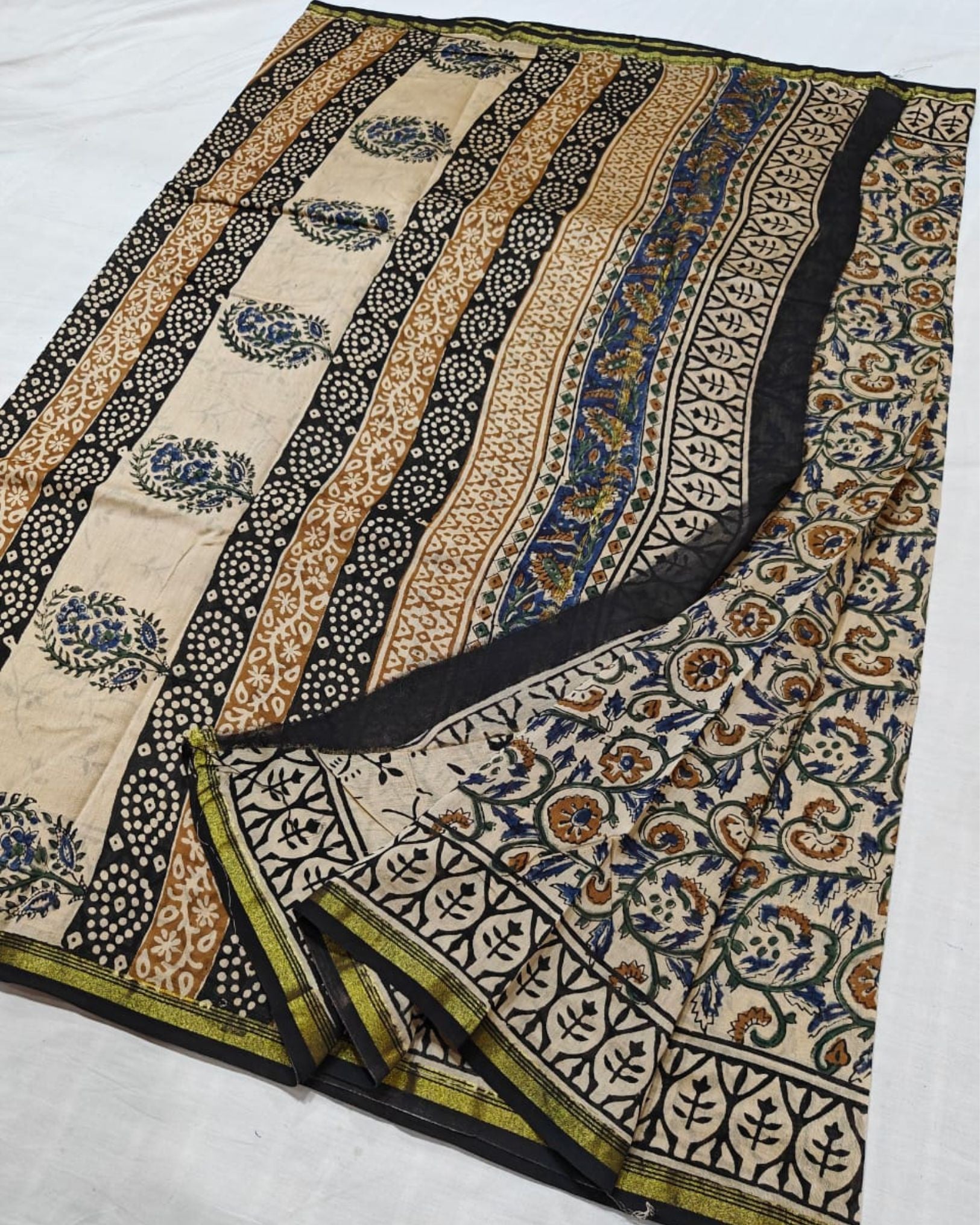 **Kalamkari** is a traditional Indian textile art that combines hand-carved wooden blocks and natural dyes to create intricate designs, often inspired by mythology, nature, and folk tales. Originating from Andhra Pradesh and Telangana, this technique involves multiple steps of dyeing and printing, resulting in vibrant, detailed patterns on cotton or silk fabrics.
