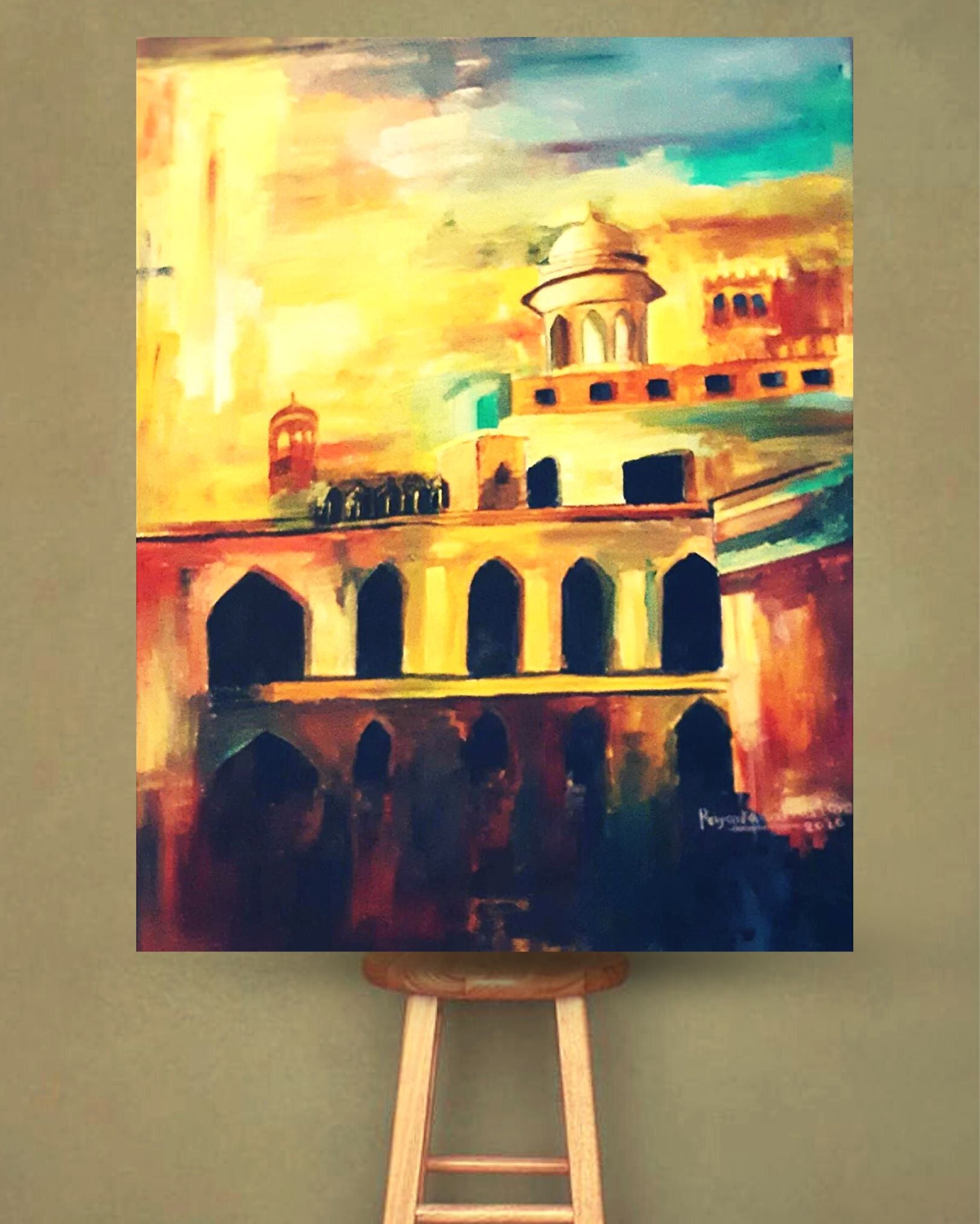 The monument is inspired by one of the Fort situated in Lahore and this is the abstract form of the fort . Comes with artist signature and a certificate of authentication. unframed comes in canvas board