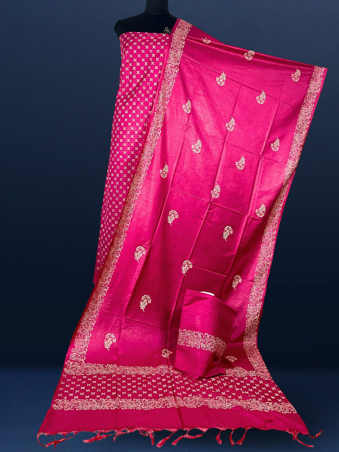 A Suit Piece with Bottom and Dupatta refers to a set of fabric pieces used to create a traditional Indian suit ensemble. It includes a fabric for the suit's top (kameez), bottom (salwar or pants), and a matching or contrasting dupatta (scarf).