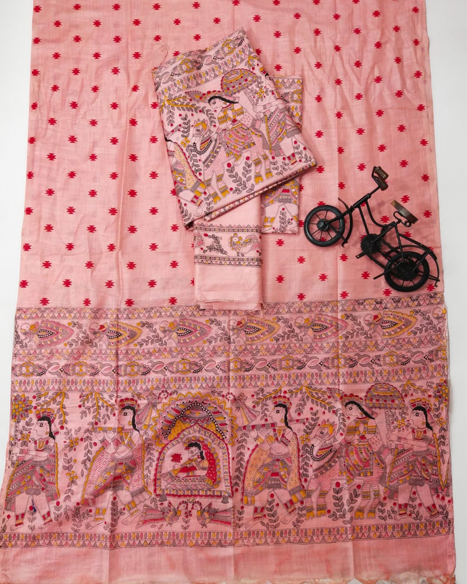 Madhubani handblock print combines the intricate motifs of Madhubani art with the traditional block printing technique. Artisans carve wooden blocks with Madhubani-inspired designs, which are then used to print patterns onto fabric. This process results in vibrant and detailed textiles, often depicting scenes from nature, mythology, or everyday life, with a unique cultural charm.