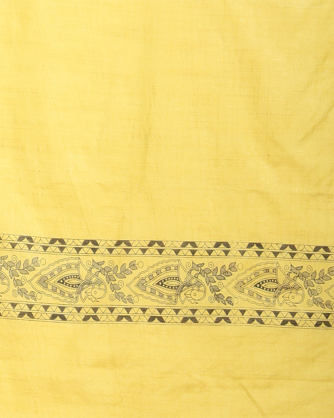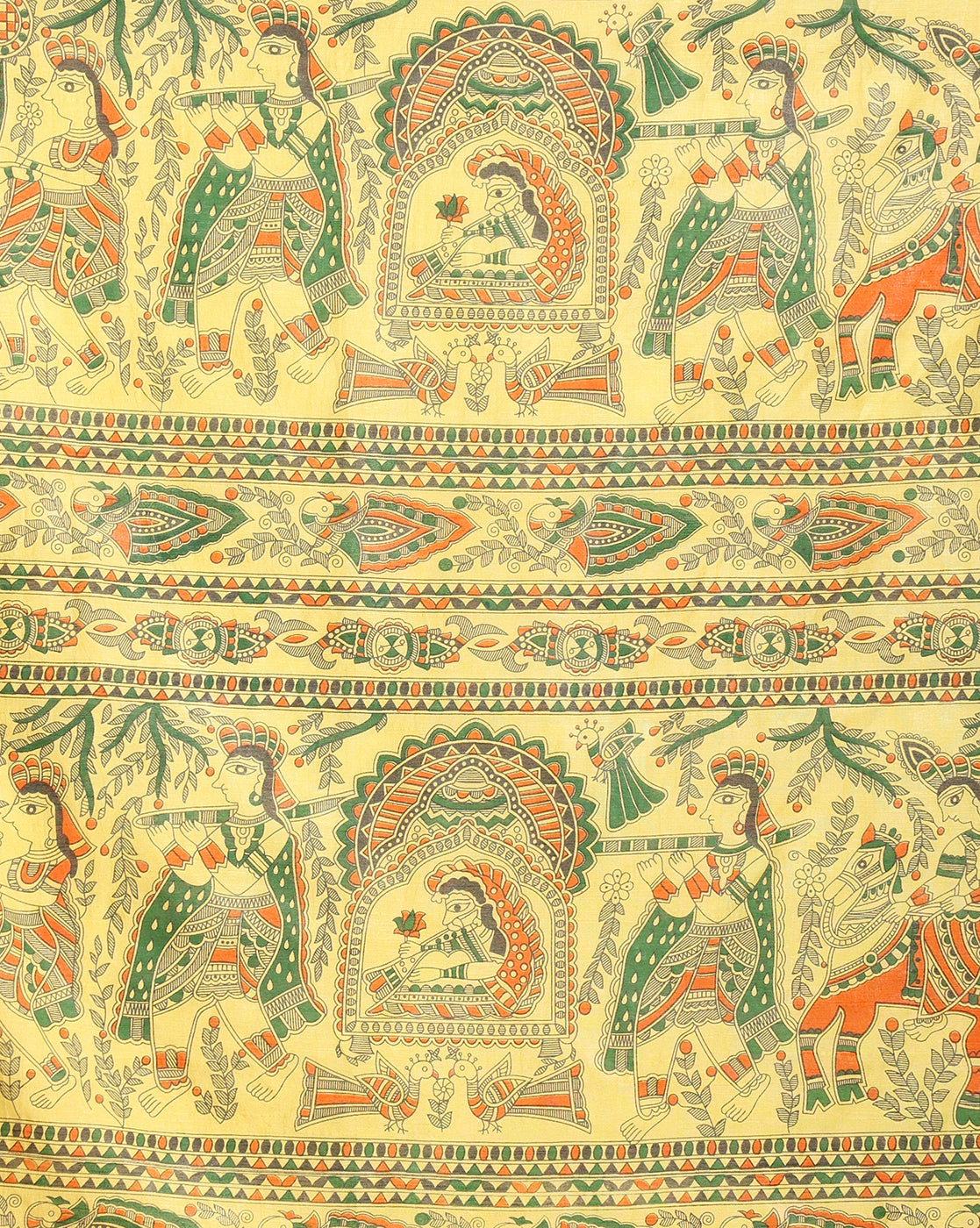 Madhubani handblock print combines the intricate motifs of Madhubani art with the traditional block printing technique. Artisans carve wooden blocks with Madhubani-inspired designs, which are then used to print patterns onto fabric. This process results in vibrant and detailed textiles, often depicting scenes from nature, mythology, or everyday life, with a unique cultural charm.