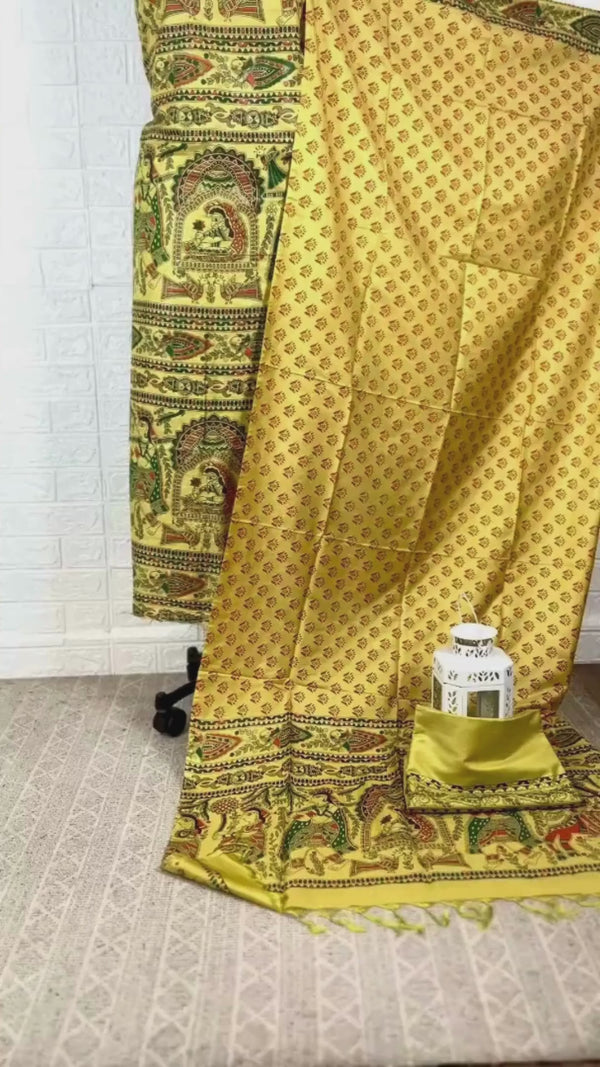 Experience the beauty of art with our Handcrafted Katan Silk Madhubani Suit. Adorned with intricate Madhubani motifs on luxurious Katan silk fabric, each suit showcases traditional craftsmanship and cultural heritage.