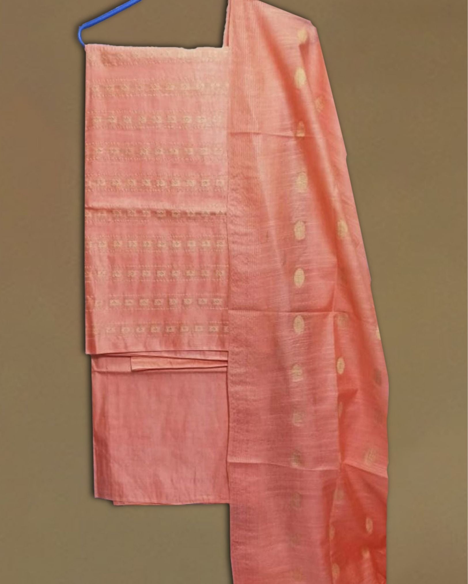 A Katan Silk Suit Piece is handcrafted with intricate weaving techniques using pure silk threads. Each piece showcases meticulous craftsmanship and exquisite designs.