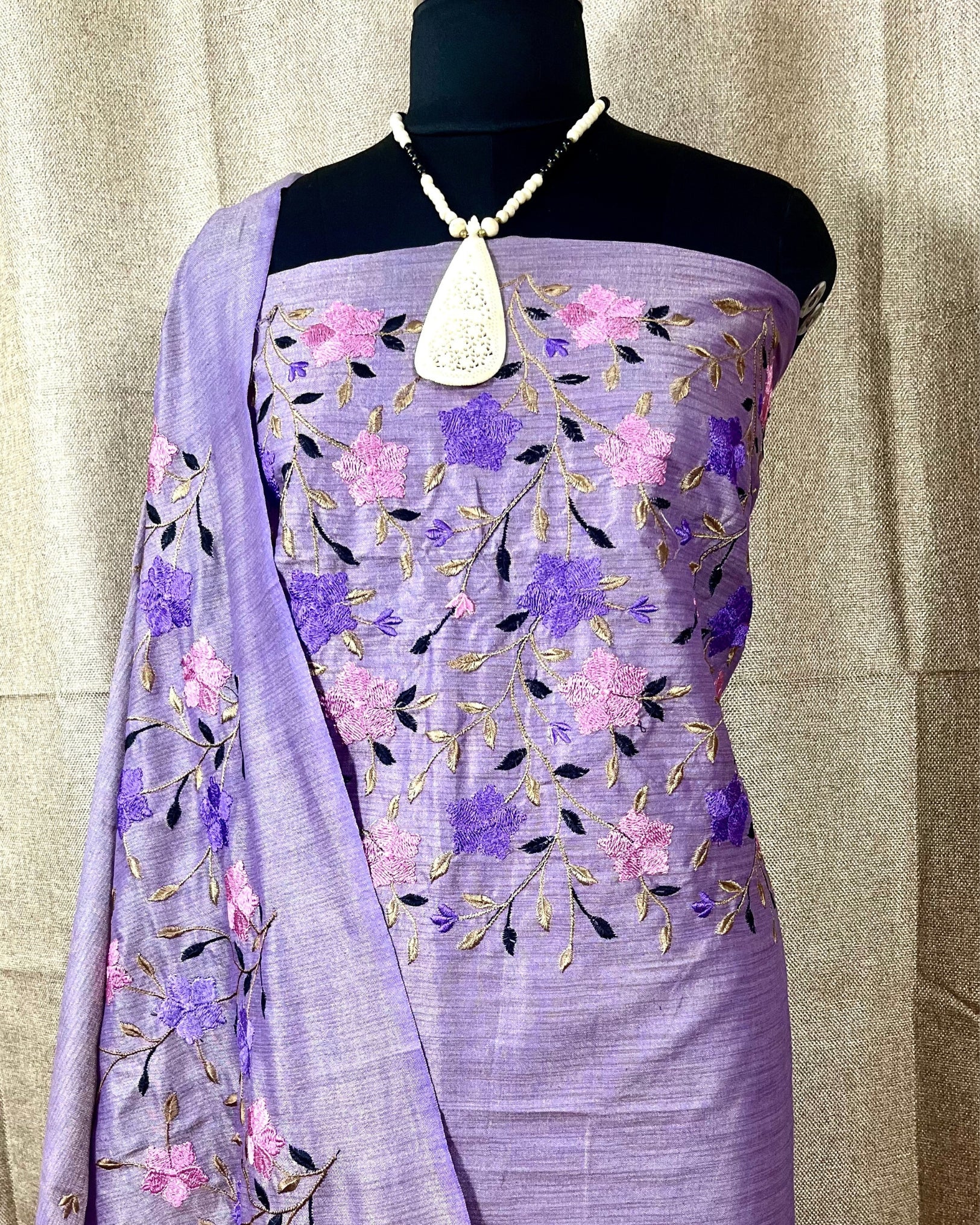 Work: Embroidery Measurements: Top: 2.4-2.5 Meter Length, Bottom: 2.4-2.5 Meter Length, Dupatta: 2.4-2.5 Meter Dupatta Fabric: Khadi Cotton Package Contains: Unstitched Fabric: Top + Bottom + Dupatta Wash Care: Gentle Handwash with Mild detergents. Wash separately. Dry in Shades. Disclaimer: Color hues may slightly vary from that which appears in the image due to different screens and displays Minor irregularities is the uniqueness of handcrafted products and makes each piece exquisite