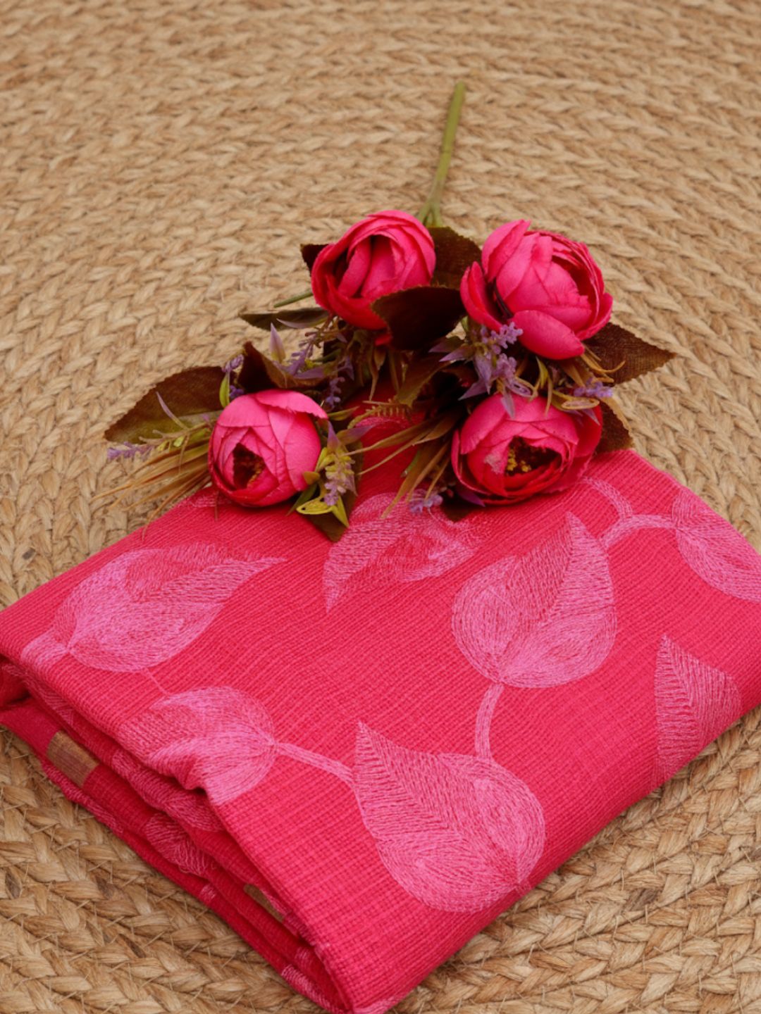 This saree is produced in Kota, Rajasthan, and involves a detailed process where cotton threads are woven into a delicate, translucent fabric. The intricate embroidery work is then carefully added, showcasing the expertise and creativity of the artisans.