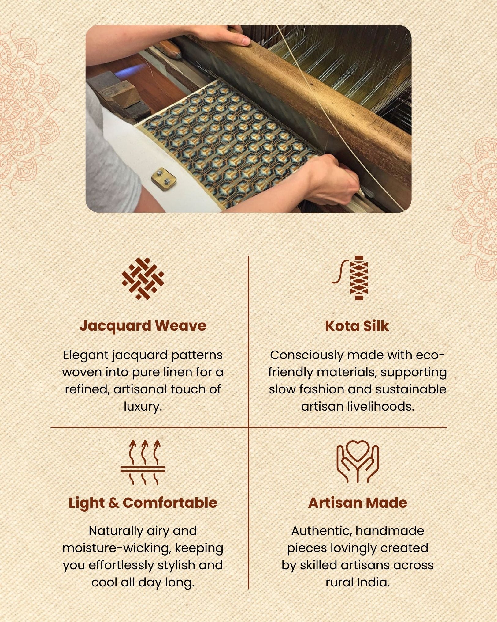 Experience luxury with our Handcrafted Kota Silk Jacquard Saree. Intricately woven with Jacquard patterns on fine Kota silk fabric, each saree offers opulence and sophistication, perfect for making a statement at any event.