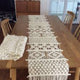 The Macrame White Table/Bed Runner measures approximately 14 inches in width and 72 inches in length, making it suitable for various table sizes or as a bed accent.