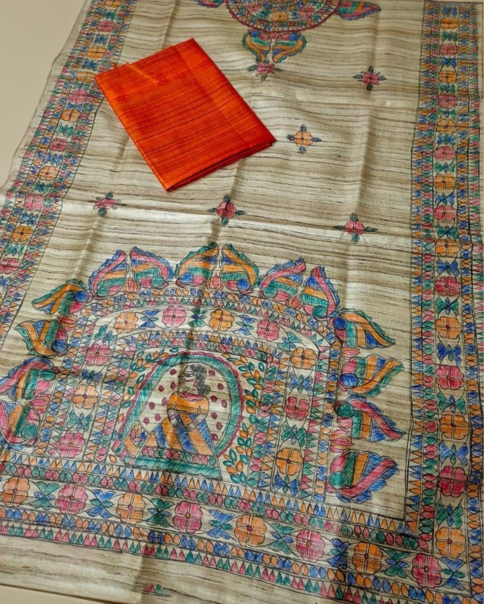 Silkmark Tussar Beige Madhubani Glossy Dupatta & Orange Top