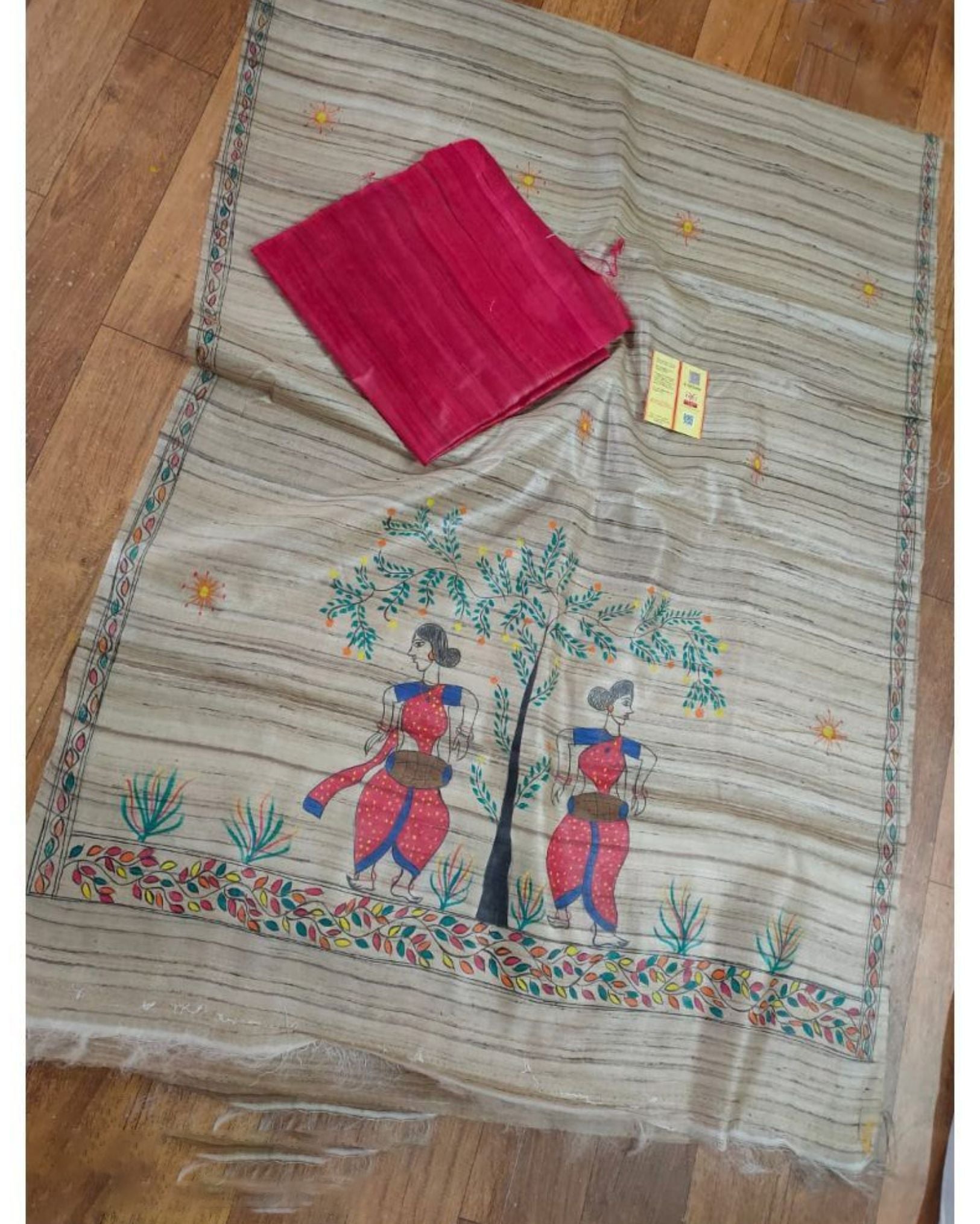 Tussar Silk is an exquisite thread obtained from a wide winged moth that is yellowish-brown in colour. Much of it is produced in Bhagalpur where it is called Bhagalpur silk. Madhubani print refers to a traditional style of painting that originated in the Mithila region of India, particularly in the villages of Bihar. Also known as Mithila painting, it is a form of folk art that has a rich history and cultural significance.Today, Madhubani prints have gained recognition globally and are often used in various art forms, including textiles, home decor items, and contemporary art. The intricate and colorful nature of Madhubani prints makes them highly sought after for their aesthetic appeal and cultural richness.