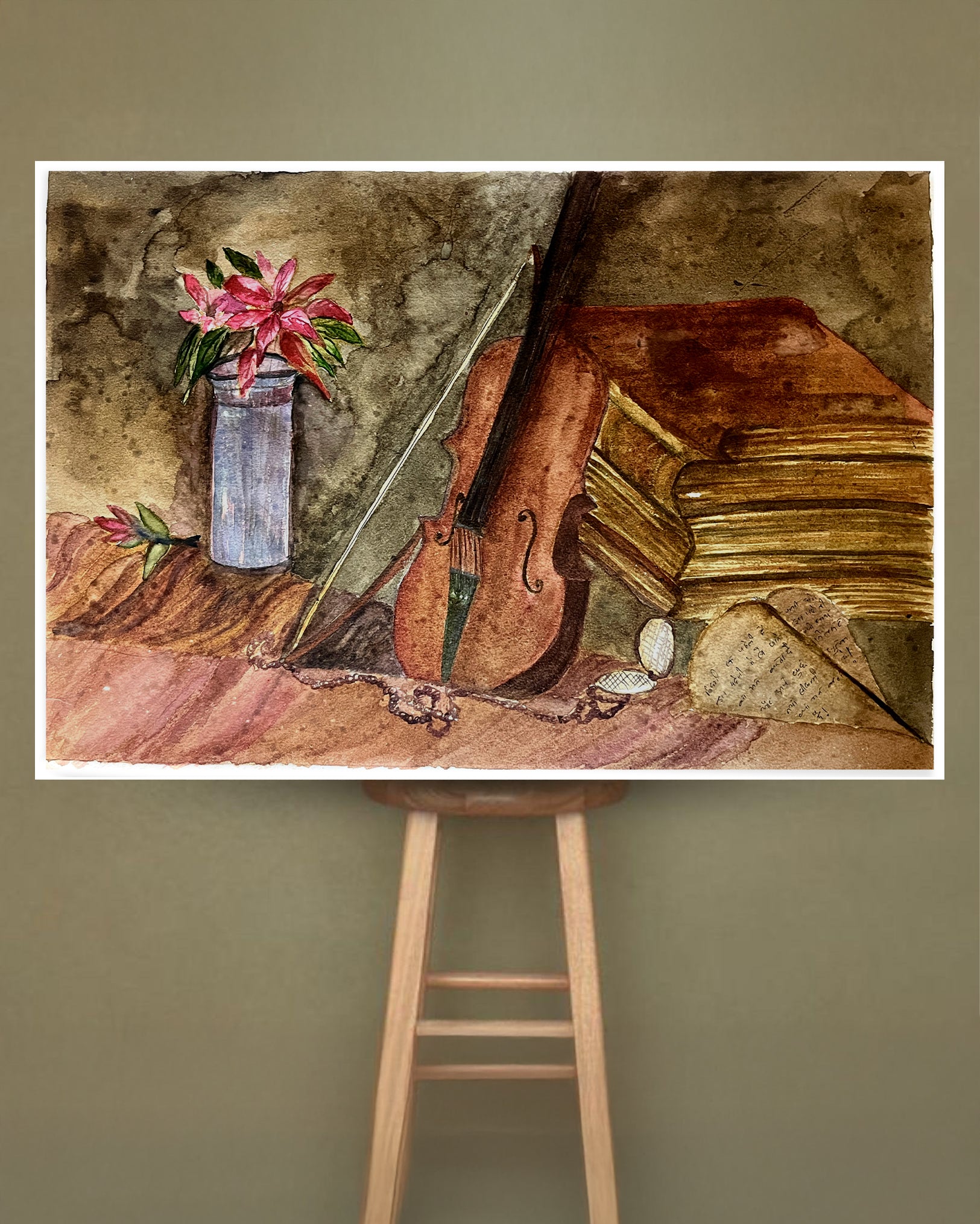 This painting, titled "Mai Aur Mera Sangeet," evokes a nostalgic harmony of art and emotion. Featuring a violin resting beside aged books, handwritten sheets, and vibrant flowers in a vase, it beautifully symbolizes a soul immersed in music and memory. Each element is brought to life through delicate coffee tones, blending tradition and passion into a timeless still-life composition.