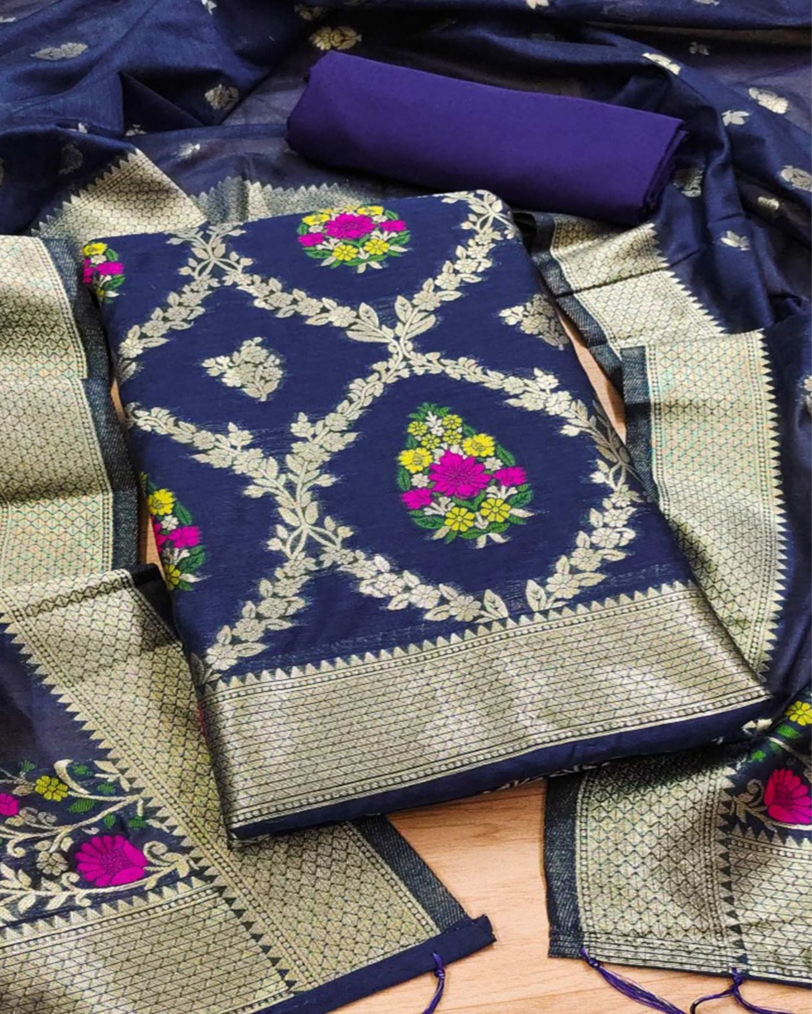 Elevate your ethnic wardrobe with our Banarasi Cotton Suit featuring exquisite brocade weaving, blending timeless tradition with contemporary elegance. Perfect for festive occasions, celebrations, and graceful everyday wear.