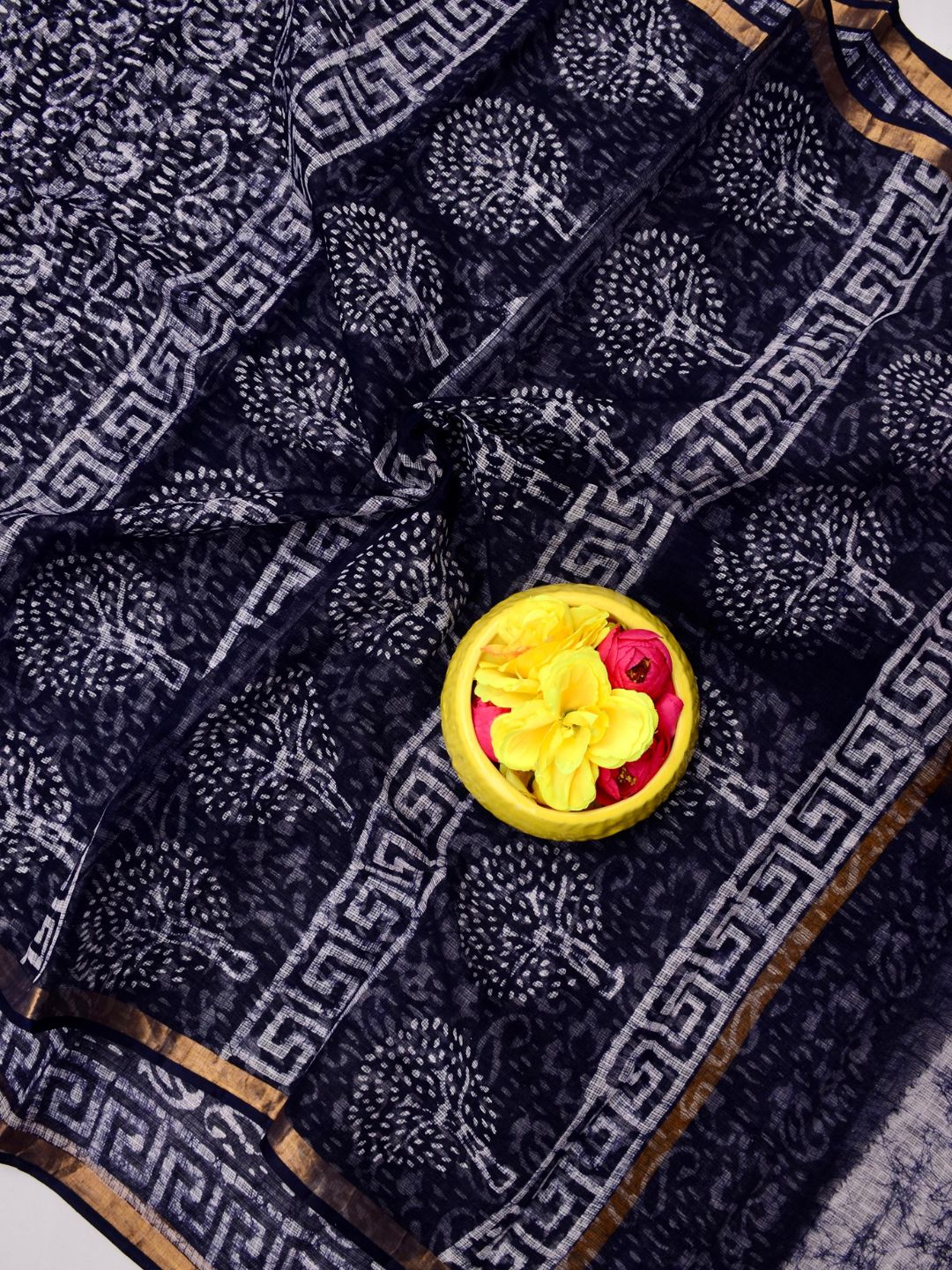 * The saree is dipped in natural or fabric dyes, creating vibrant Batik patterns