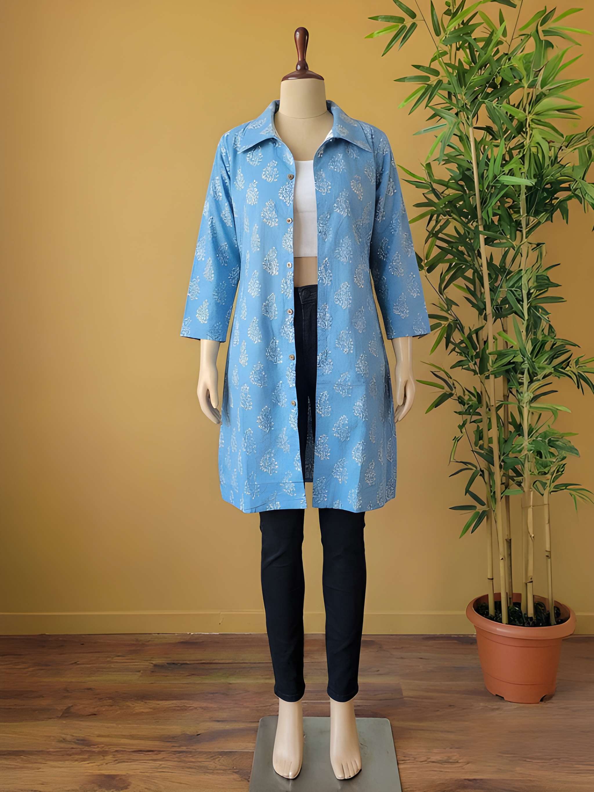 A Pure Cotton Hand Block Print Jacket is a handcrafted outerwear piece made from pure cotton fabric. Artisans decorate the fabric using traditional hand block printing. You can layer it over kurtas, dresses, tops, or sarees.