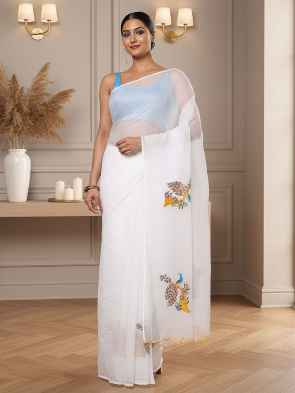 Vibrant White Pure Kota Doria Saree Embroidered