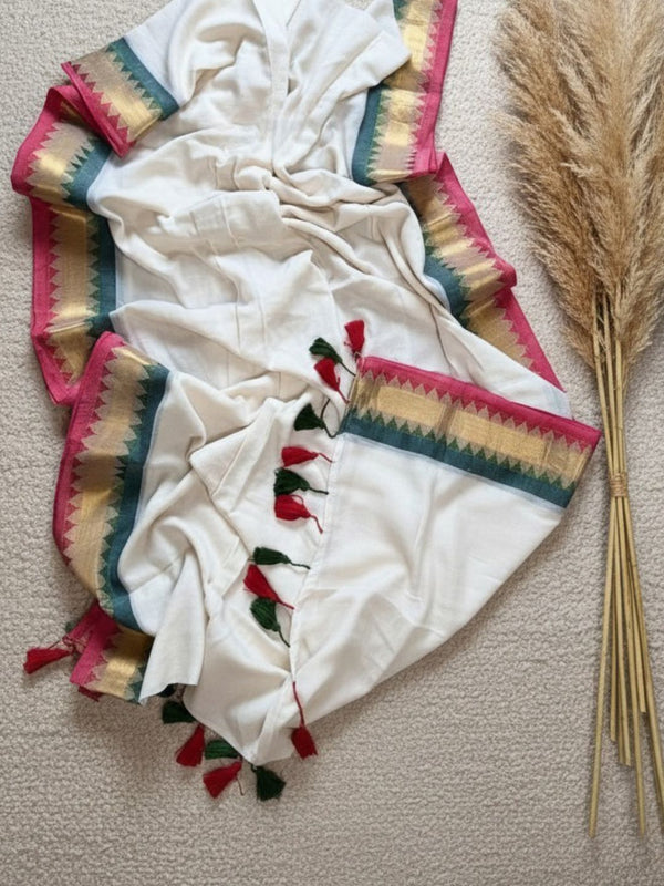 Baadal Baani White Pure Mul Cotton Handloom Saree