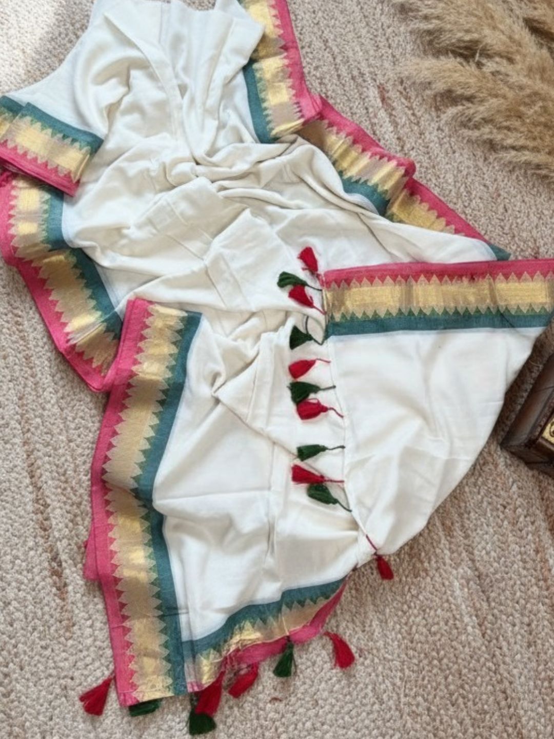 * Each saree is handcrafted meticulously, ensuring uniformity while retaining the charm of handmade fabric.