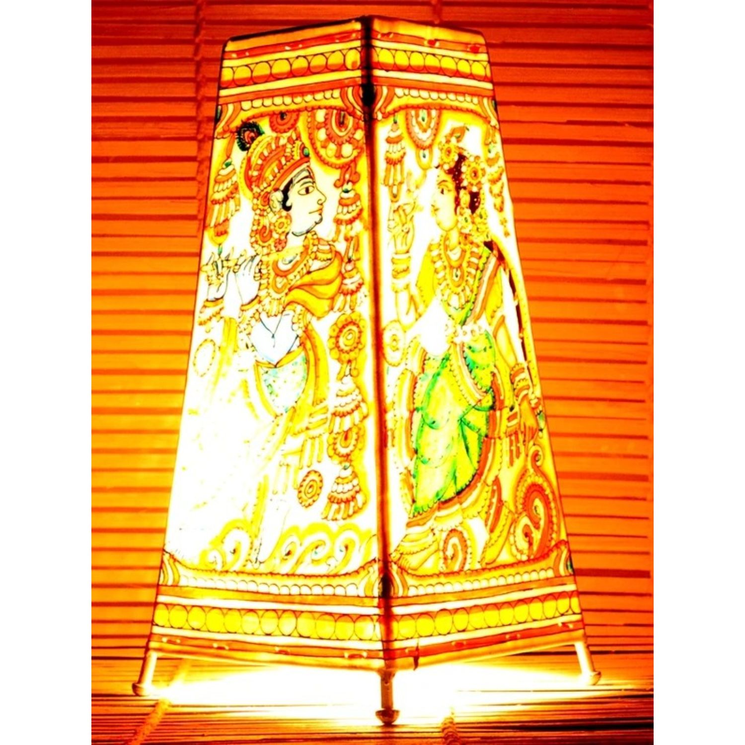 Unique Krishna Radha Kalamkari Handpainted Standing Round Leather Lamp -9 Inch