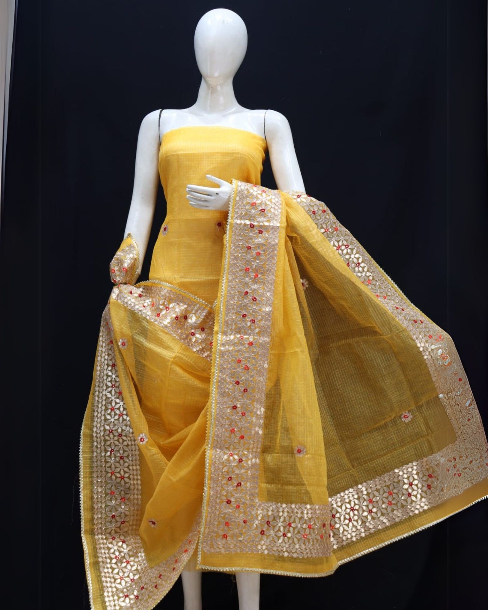 Grace your wardrobe with this elegant Kota Cotton Gota Patti Embroidery Suit Set. Crafted with intricate detailing, it's perfect for festive occasions, offering a timeless blend of tradition, comfort, and style.
