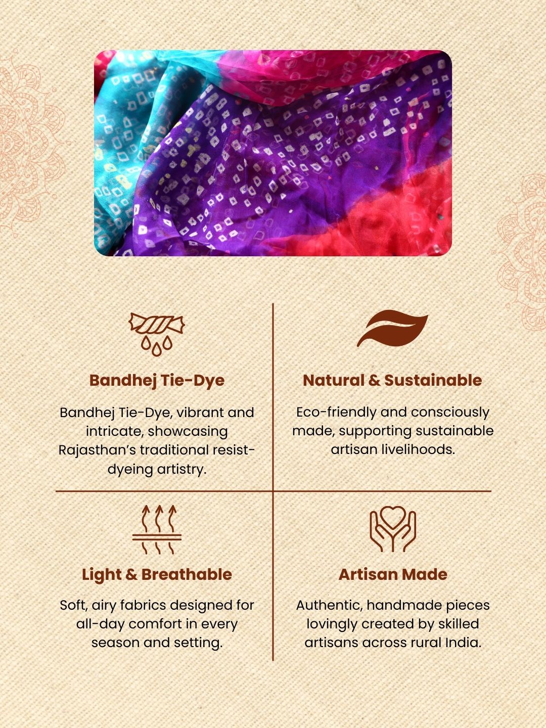 Bandhej tie-dye, also known as Bandhani, is a traditional Indian textile art where fabric is tied into small knots before dyeing to create intricate patterns. Originating in Gujarat and Rajasthan, Bandhej showcases vibrant colors and detailed designs like dots, waves, or motifs. This eco-friendly technique is popular in sarees, dupattas, and ethnic wear.