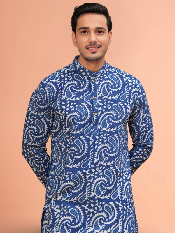 A Cotton Designer Men's Kurta Handblock Printed is a traditional Indian garment for men, crafted from cotton fabric and adorned with intricate handblock printing. It features unique patterns and designs created using wooden blocks.