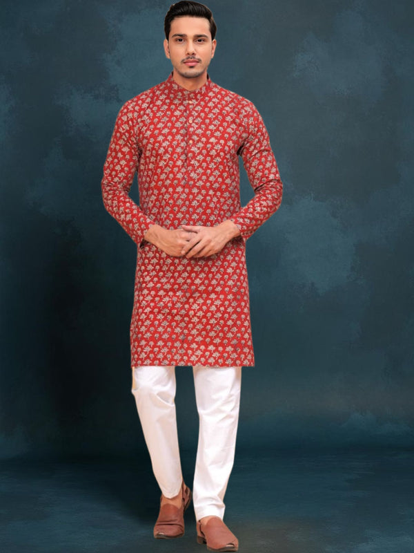 Royal Reflection BlockPrinted Cotton Kurta Pyjama Rich Red