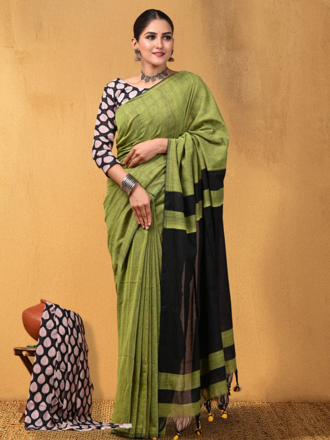 Earthloom Handdyed Khadi Cotton Saree Leafy Green