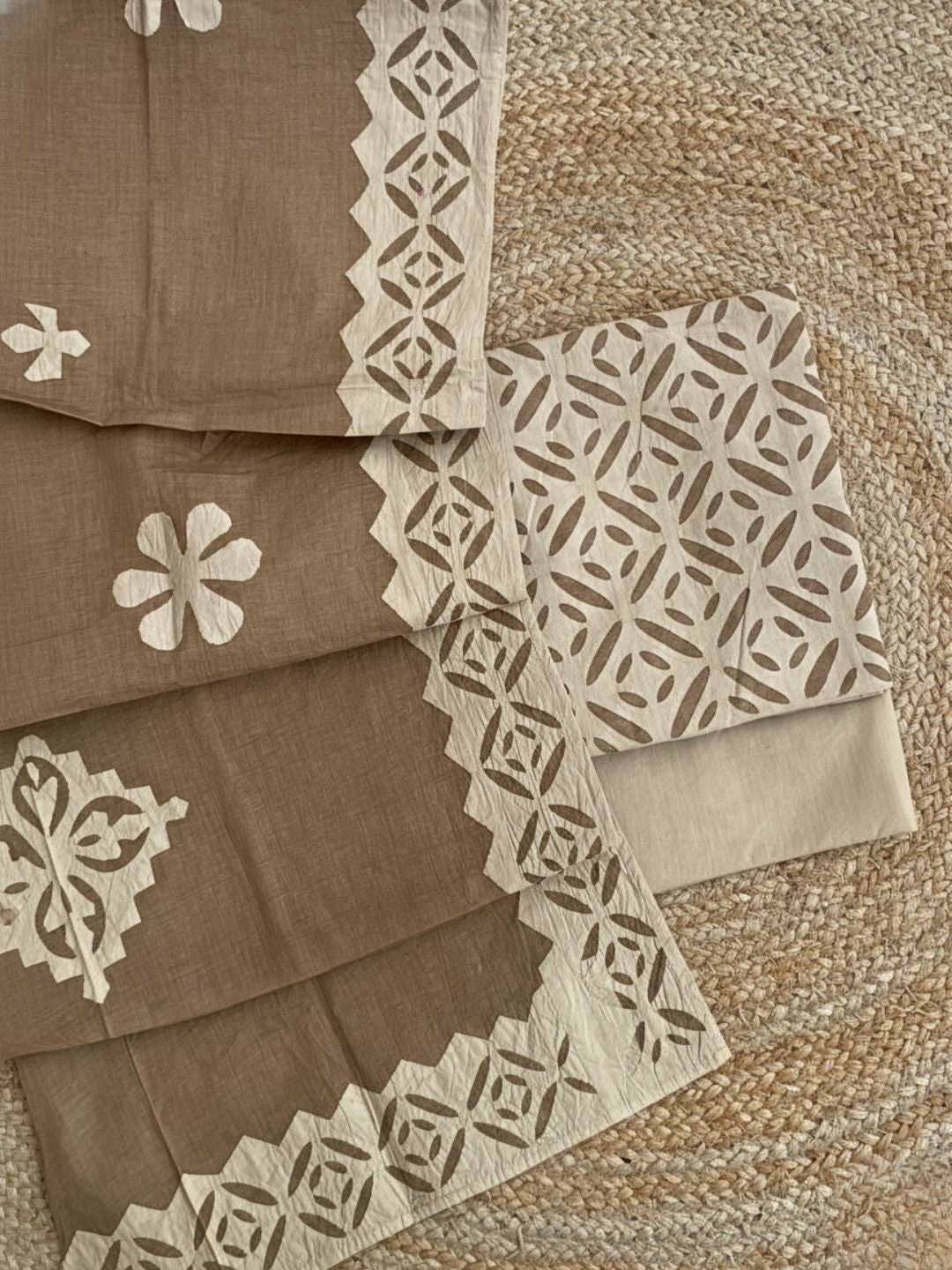 Appliqué work cotton suit set with top, bottom, and dupatta. Soft, breathable fabric with handcrafted detailing, ideal for festive occasions, casual gatherings, or elegant everyday ethnic wear.