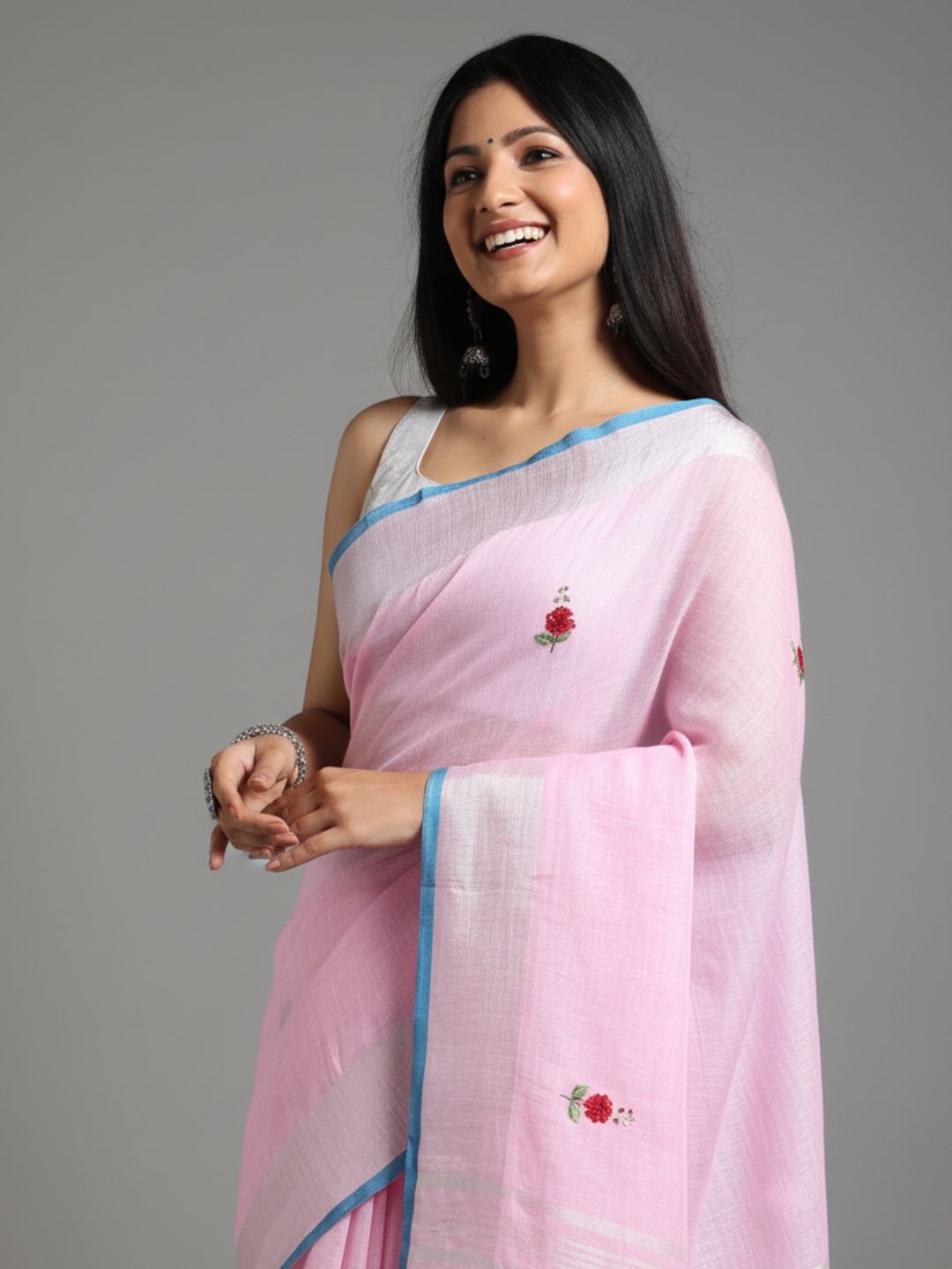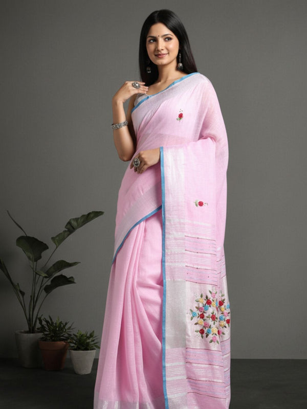 A Pure Linen Floral Embroidered Saree features linen fabric adorned with intricate floral embroidery along the borders, complemented by a zari border and a decorative striped pallu. The saree combines traditional craftsmanship with elegant design elements.