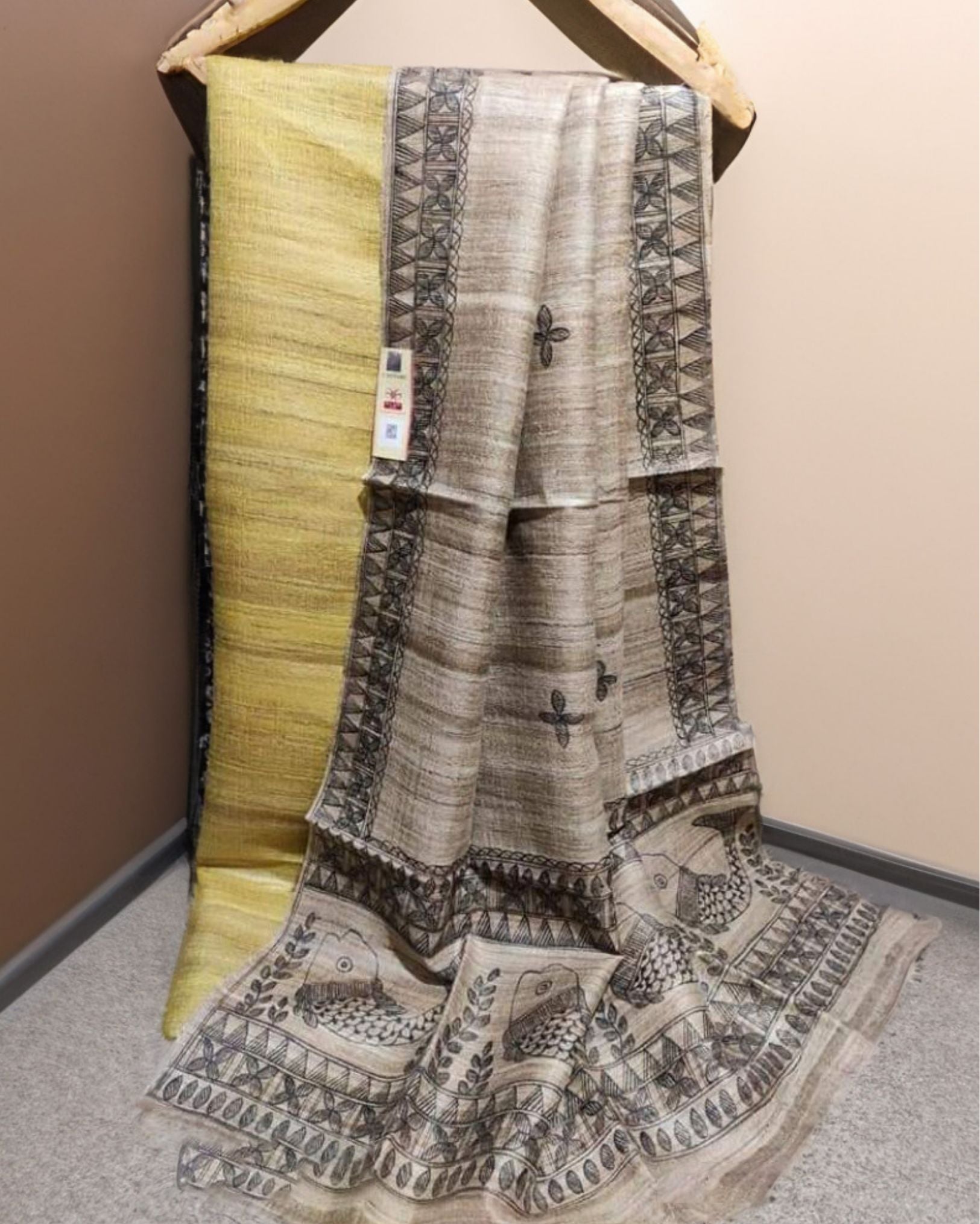 Make a style statement with our Handcrafted Silkmark Tussar Madhubani Suit. Featuring traditional Madhubani paintings on Tussar silk fabric, each suit exudes elegance and charm, perfect for weddings, festivals, and special occasions, adding a touch of cultural flair to your look.