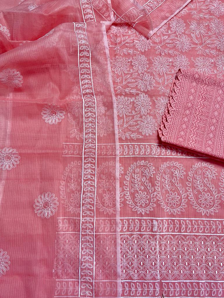 Embroidered Kota Doria Suit Pink (Top+Dupatta+Bottom)