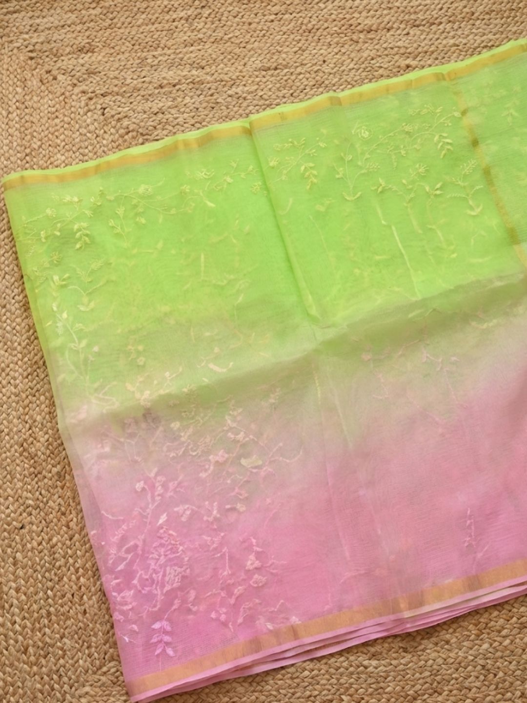 This saree is produced in Kota, Rajasthan, and involves a detailed process where cotton threads are woven into a delicate, translucent fabric. The intricate embroidery work is then carefully added, showcasing the expertise and creativity of the artisans.