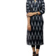 The Pure Cotton Ikkat Handblock Printed Prestitched Dress is a ready-to-wear garment crafted from pure cotton fabric. It features Ikkat patterns created using the handblock printing technique, showcasing traditional Indian textile art.