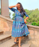 The Pure Cotton Ikkat Handblock Printed Prestitched Dress is a ready-to-wear garment crafted from pure cotton fabric. It features Ikkat patterns created using the handblock printing technique, showcasing traditional Indian textile art.