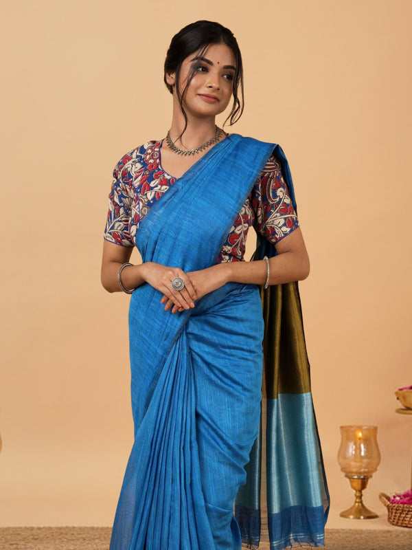 Volant Silk Linen Handdyed Blue Contrast Pallu Saree