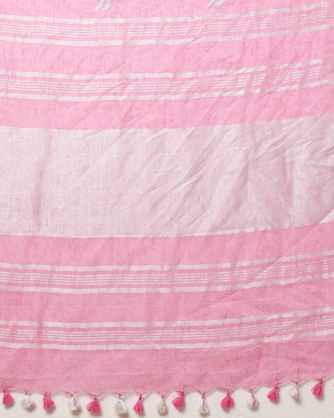 A Pure Linen Embroidered Handloom Saree features linen fabric handwoven on a loom, adorned with intricate embroidery along the borders and a striped pallu. The saree showcases traditional handloom craftsmanship with elegant design details.