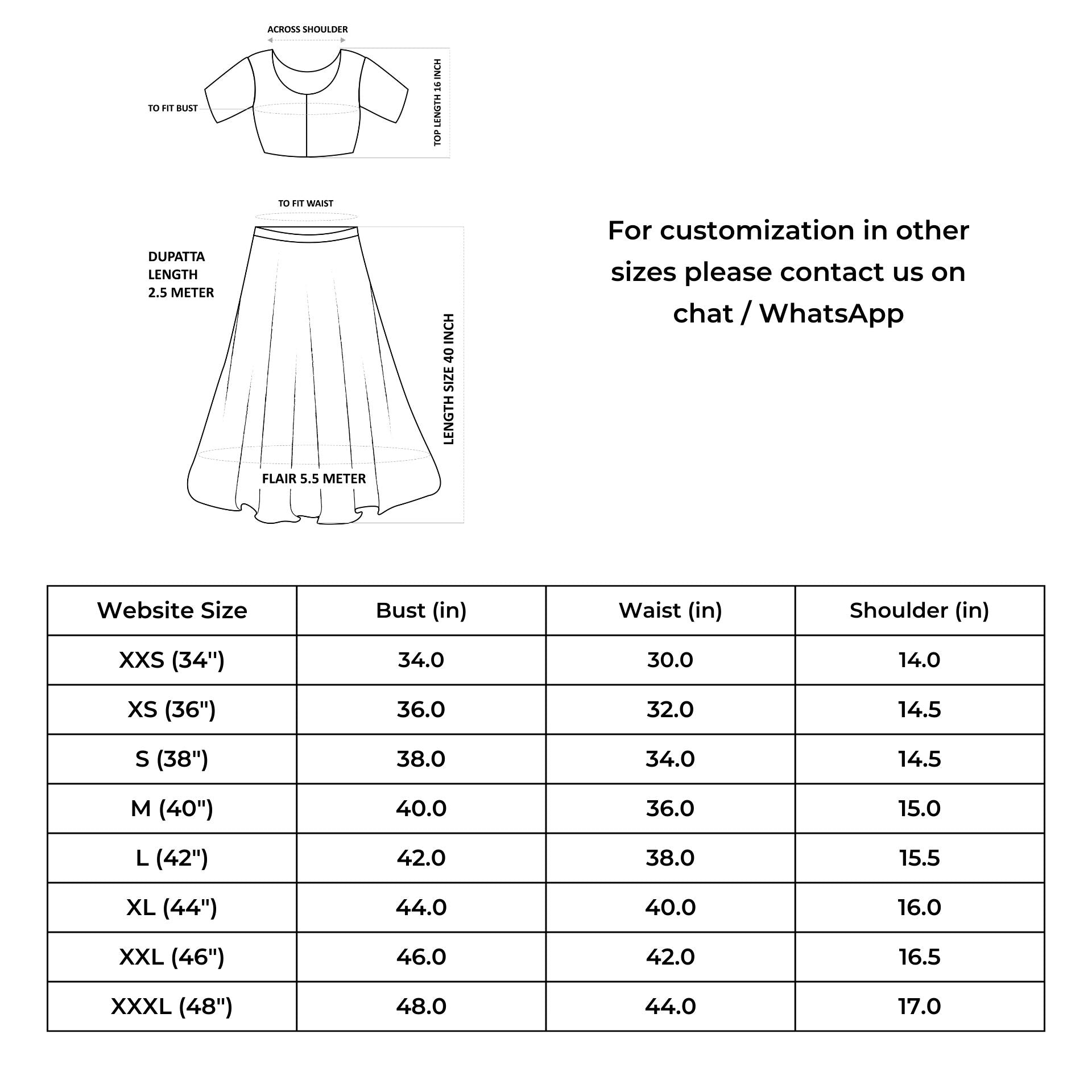 This Handblock Printed Gota Patti Lehenga Choli set is available in sizes ranging from 38 to 46, offering a comfortable fit for different body sizes. It's important to select the appropriate size based on individual measurements for a flattering look. You can customize the size as per your requirements even beyond our standard sizes.