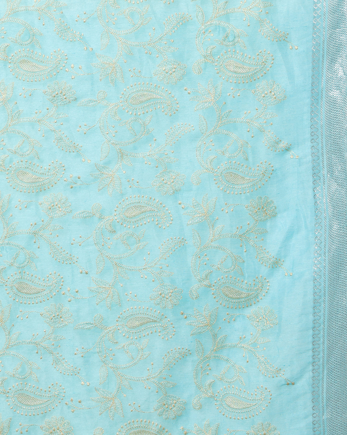 To maintain the fabric's quality and embroidery, it is recommended to dry clean the saree. Alternatively, hand wash the saree in cold water using a mild detergent and air dry it in shade. Iron on low heat if needed.