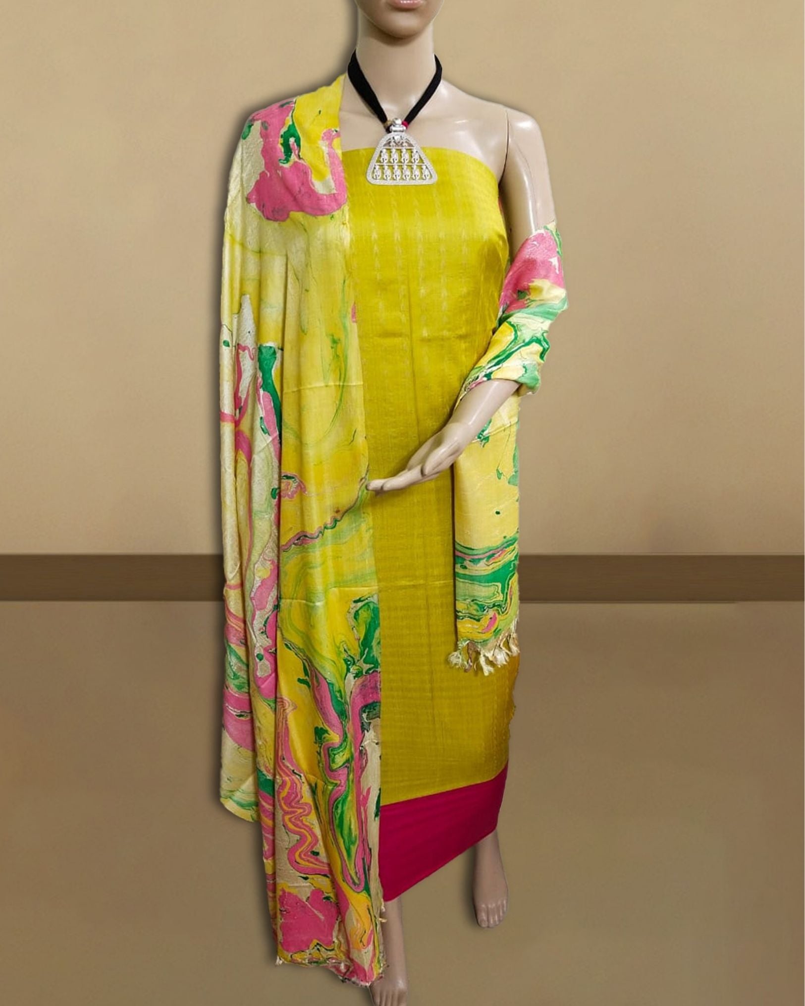 Abstract Katan Silk Tie Dyed Yellow & Pink Suit