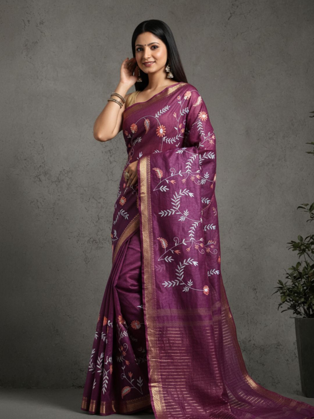 Experience sophistication with our Silk Linen Embroidery Saree. Adorned with intricate embroidery work on a blend of silk and linen fabric, each saree offers elegance and grace, perfect for formal events and social gatherings.