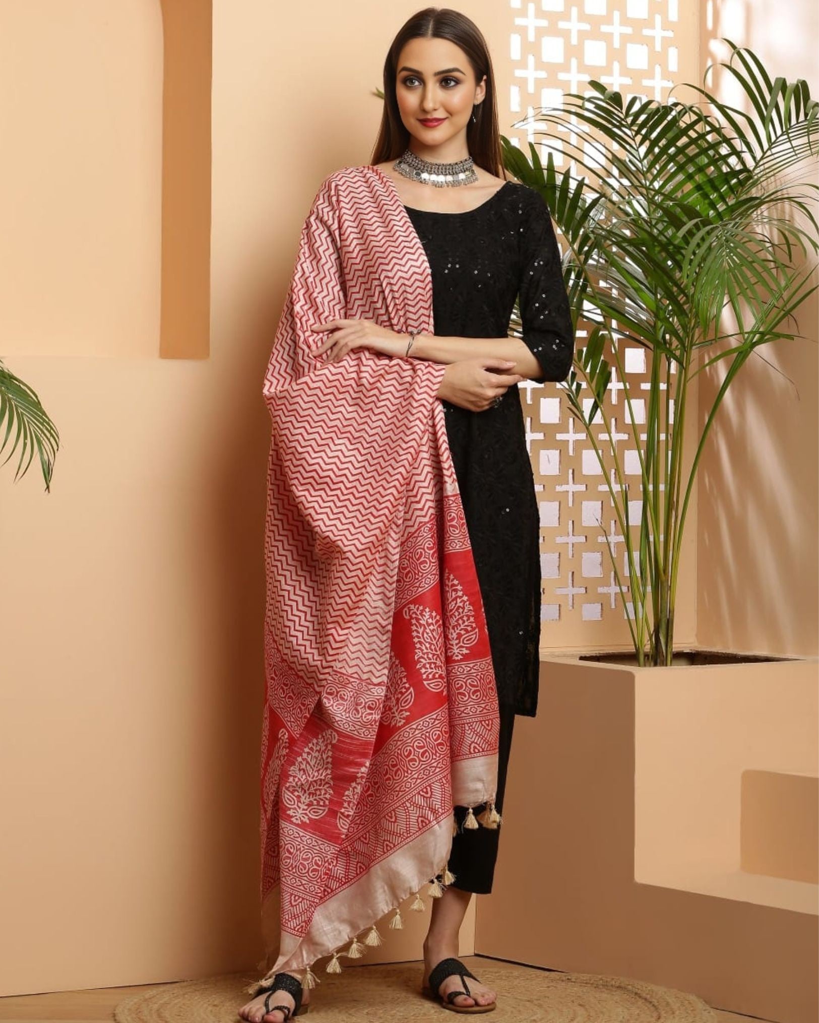 - A Katan Silk Hand Block Print Dupatta is a luxurious and lightweight dupatta made from pure Katan silk, featuring hand block printing done by skilled artisans. The fabric has a natural sheen, smooth texture, and rich appeal, making it a perfect addition to ethnic and contemporary outfits.