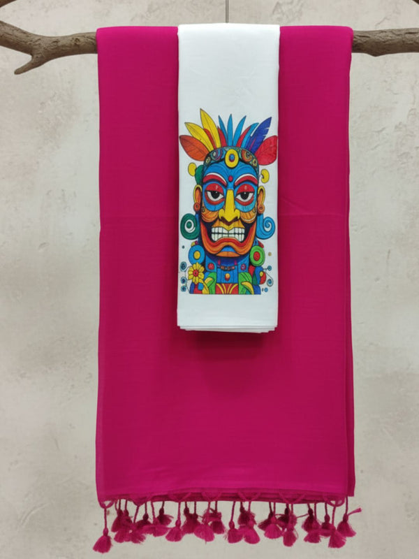 Elegant pure handloom khadi cotton saree paired with a beautifully hand-painted blouse. Soft, breathable, and timeless, perfect for festive occasions, cultural gatherings, or graceful everyday elegance.