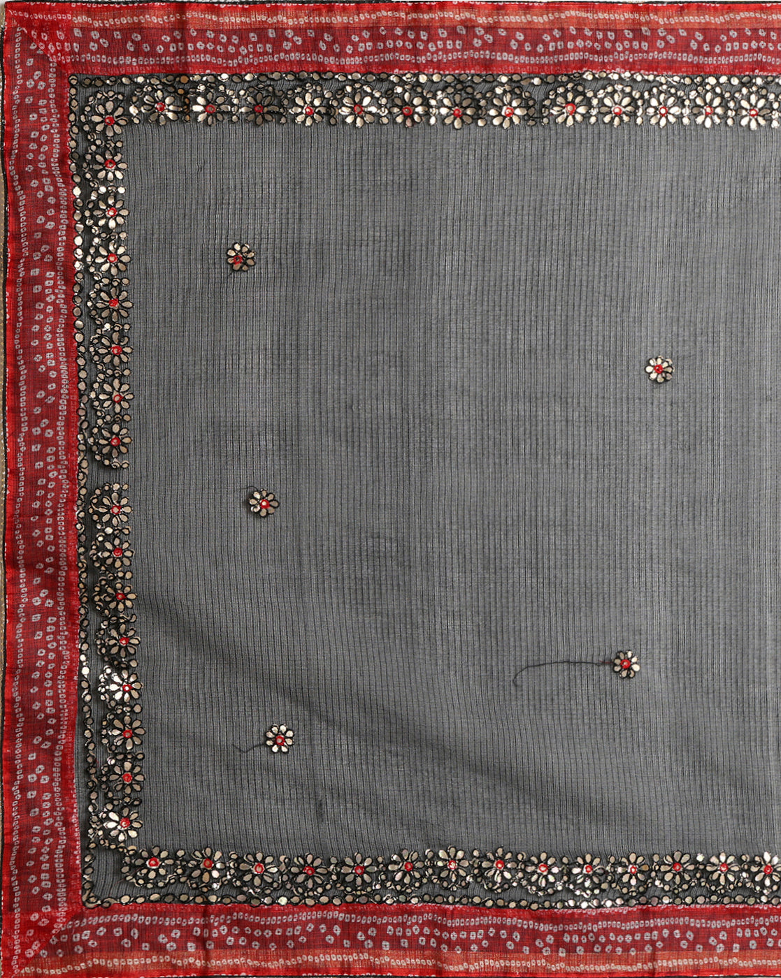 - The saree is made from high-quality Kota cotton, which is woven on traditional handlooms to achieve its characteristic lightweight and slightly stiff texture. The Gota Patti embellishments are meticulously handcrafted by skilled artisans who cut, shape, and stitch the metallic ribbons onto the fabric, creating intricate designs.