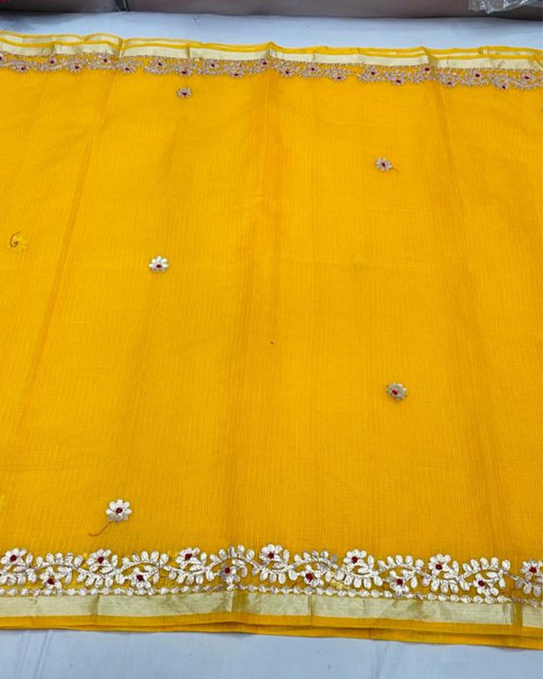 - The saree is made from high-quality Kota cotton, which is woven on traditional handlooms to achieve its characteristic lightweight and slightly stiff texture. The Gota Patti embellishments are meticulously handcrafted by skilled artisans who cut, shape, and stitch the metallic ribbons onto the fabric, creating intricate designs.