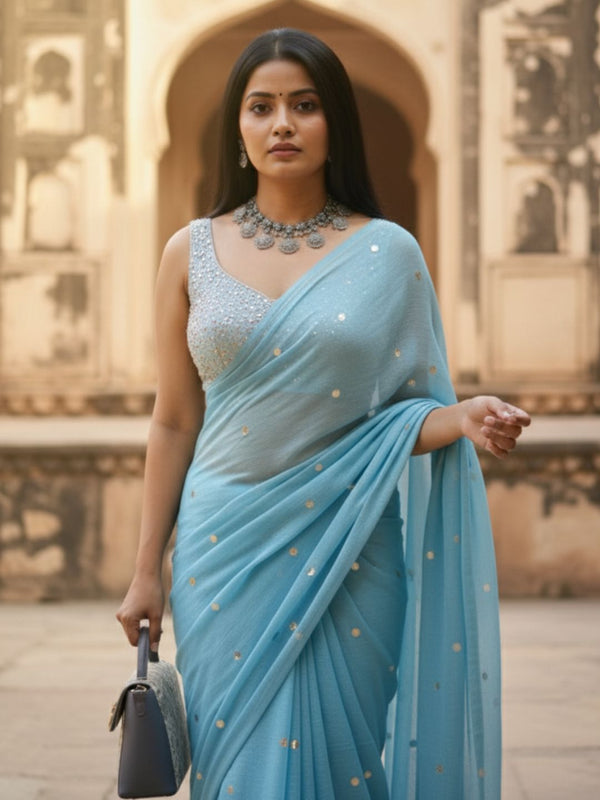 Gini Baani Pure Mul Cotton Sequin Sky Blue Saree