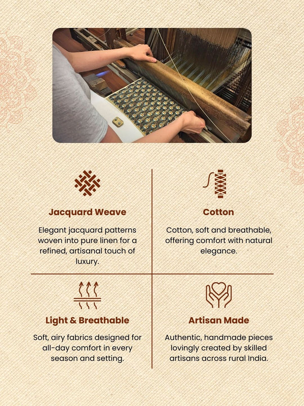 **Handwoven Jacquard** is a richly textured fabric created on a handloom equipped with a jacquard mechanism, allowing artisans to weave intricate patterns directly into the cloth. Unlike prints, the designs—florals, geometrics, or paisleys—are part of the weave, ensuring durability. This technique combines traditional craftsmanship with elegant, complex detailing.