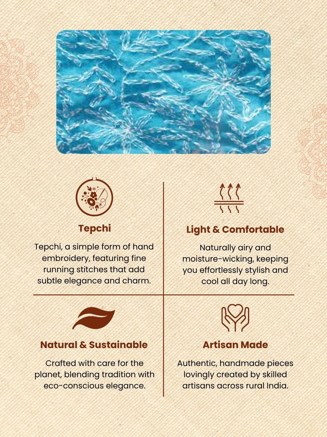 **Tepchi Handwork** is a basic Chikankari embroidery stitch done using simple running stitches along the design outline. You get a neat, delicate finish that forms the base for more detailed embroidery, keeping the fabric light, elegant, and comfortable to wear.