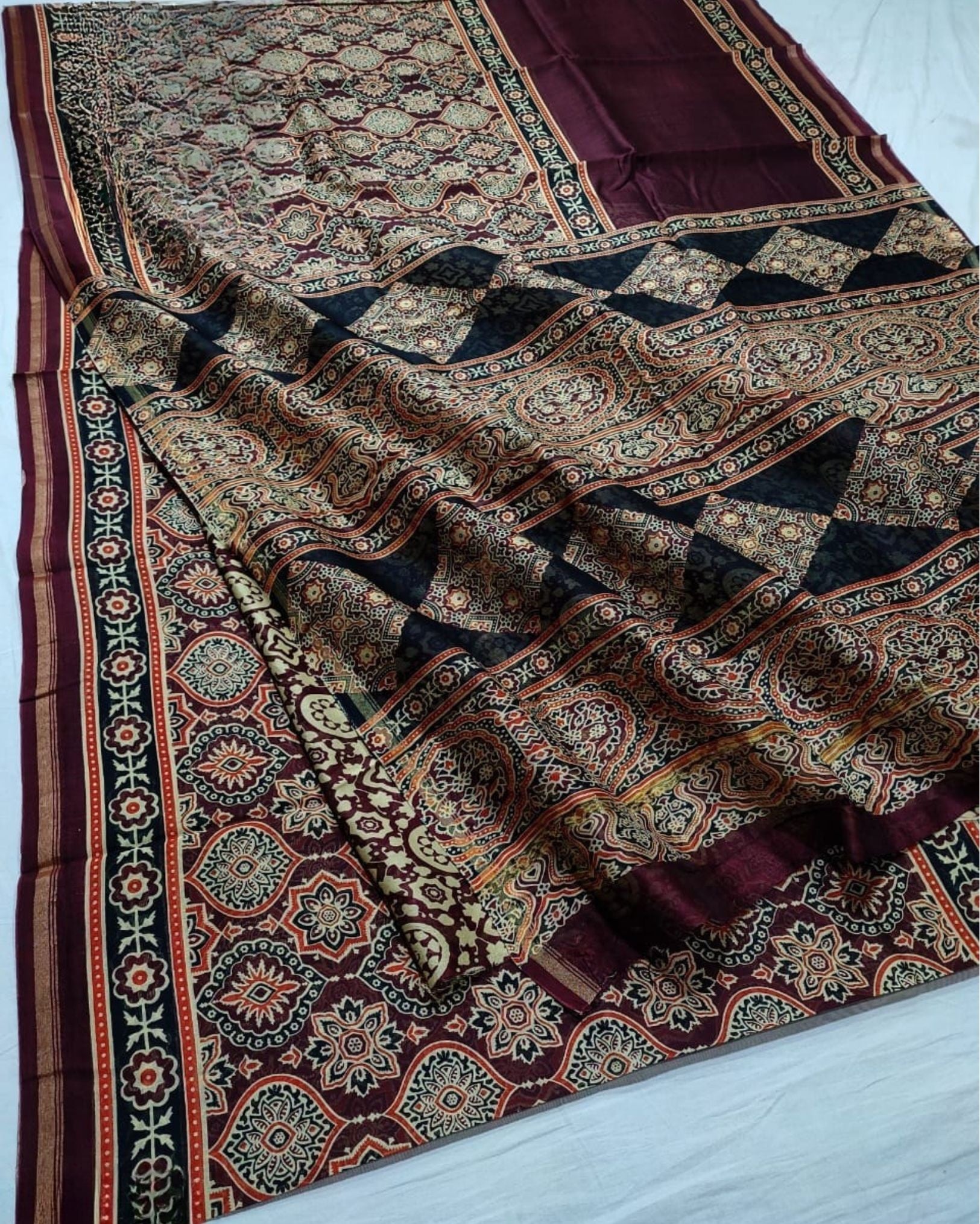Elegant Chanderi Silk Saree featuring traditional Ajrakh Printing. Lightweight, breathable, and perfect for festive occasions or cultural events. A timeless blend of heritage craftsmanship and contemporary charm for your wardrobe.