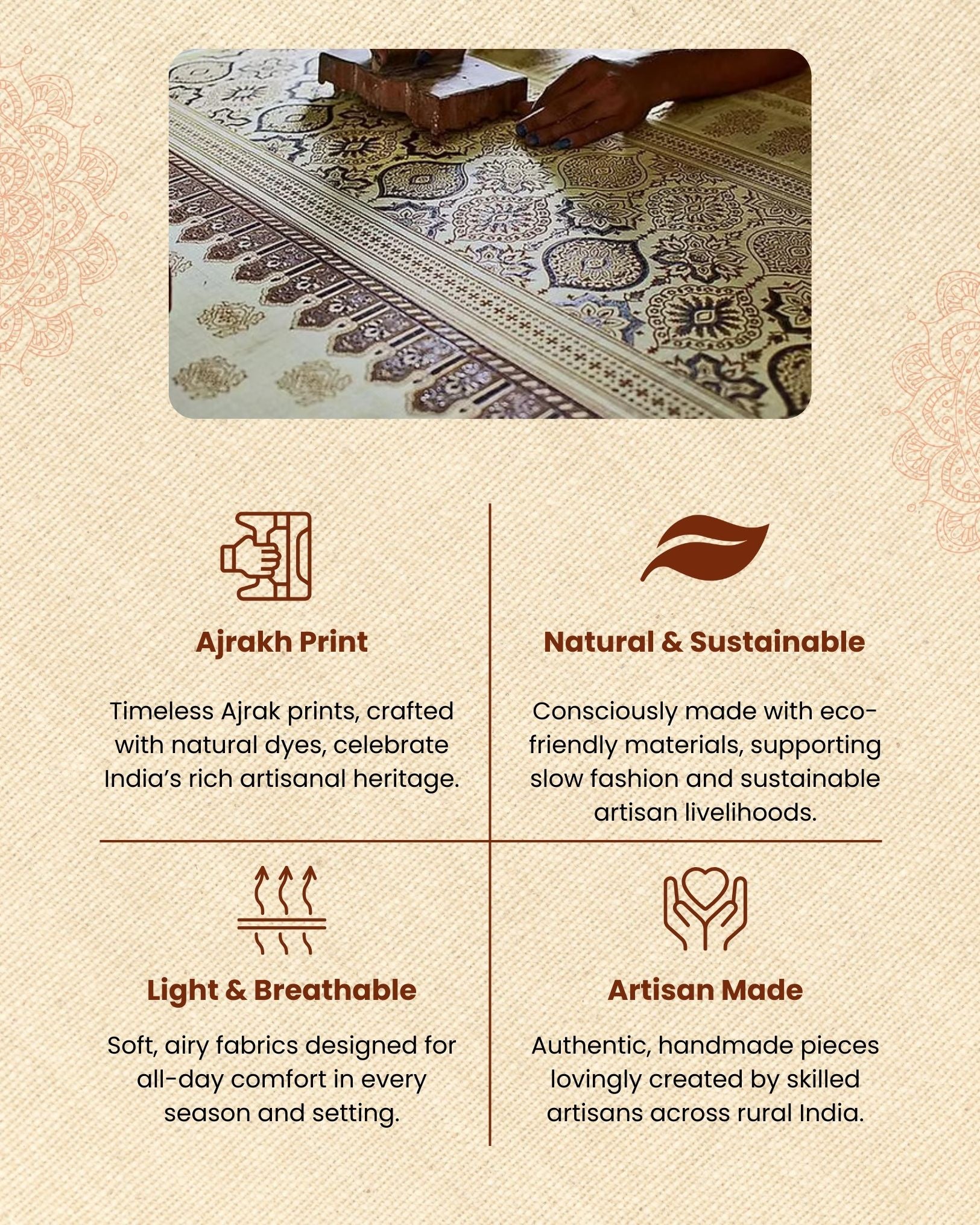 Ajrakh Printing is a centuries-old technique where intricately carved wooden blocks are dipped in natural dyes and stamped onto the fabric by hand. This craft gives each piece a unique, artisanal touch, with slight variations that enhance its handmade charm.