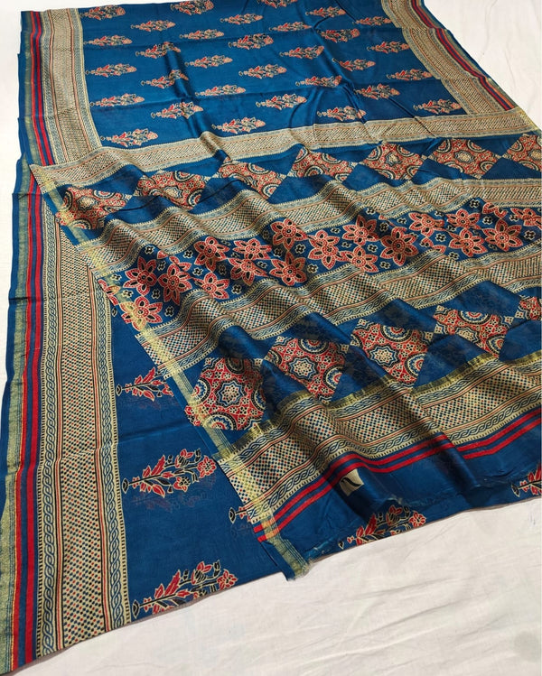 Ajrakh Printed Arapawa Blue Chanderi Silk Saree