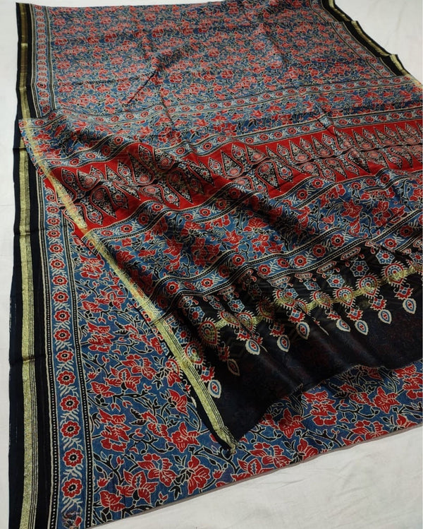 Ajrakh Printed Arapawa Blue Chanderi Silk Saree